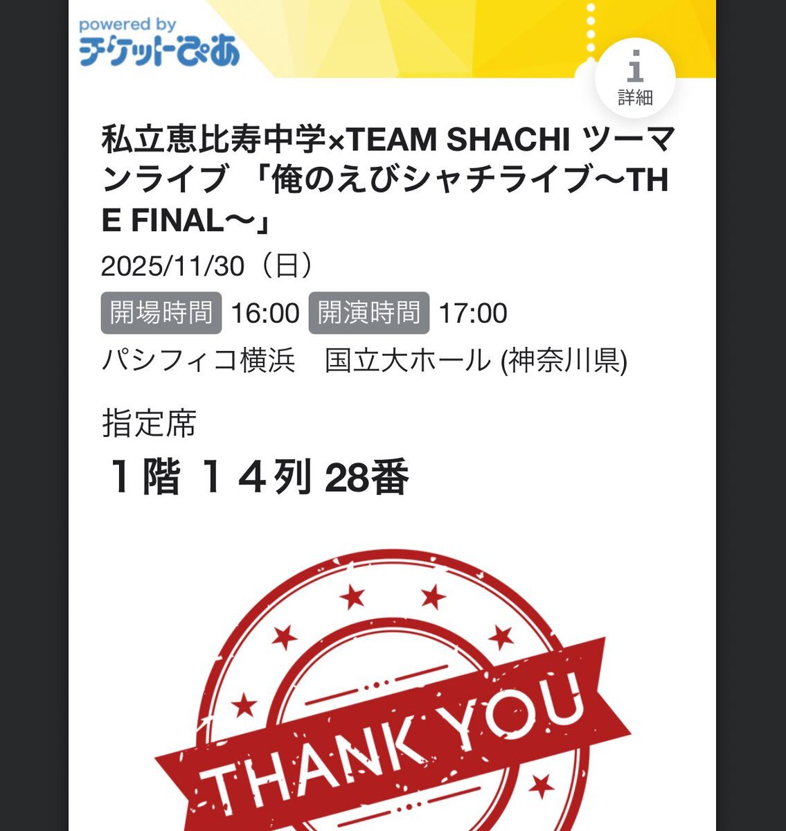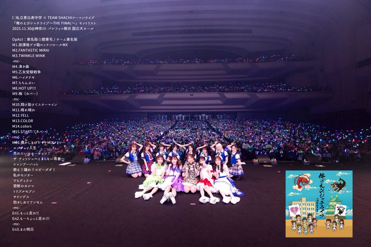#俺のえびシャチライブ 🎼私立恵比寿中学 × TEAM SHACHI 「俺のえびシャチライブ〜THE FINAL〜」 セットリスト 2025.11.30@神奈川・パシフィコ横浜国立大ホール OpAct:東名阪☆膝栗毛 / チーム東名阪 M1.放課後ゲタ箱ロッケンロールMX M2.FANTASTIC MIRAI M3.TWINKLE WINK M4.沸き曲 x.com/shachi_staff/s…