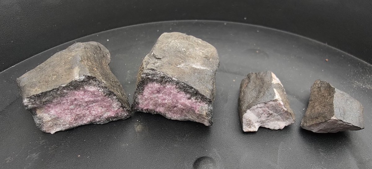 梅田鉱山へ行くついで茂倉沢鉱山へ様子見して来ました 今回は坑口途中の沢で採集 目的はバラキセキ(薔薇輝石)です ①登ってすぐの沢でも落ちてました ②③真っ黒な石を割ると綺麗なピンクが出て来ます ④オマケ 一瞬目を疑う、地表近くに浮かぶ杉の葉 #俺式お宝探し #にゃんちき写真展 pic.x.com/Dui3JjQmWO