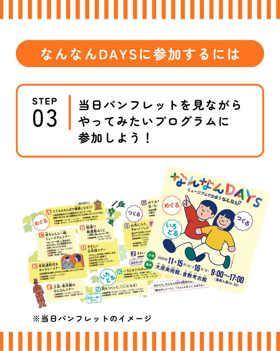 #なんなんDAYS 開催情報➀ 11月15日と16日に開催予定の「なんなんDAYS」 📷参加するにはどうしたらいいの? 📷参加方法をチェックしてみよう! #大原美術館 #倉敷考古館 pic.x.com/9VOKlQT8Oo