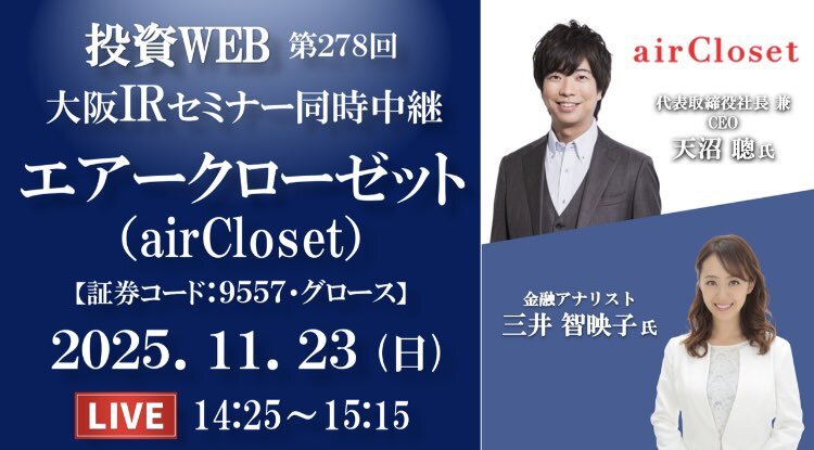 このあと14:25からは 《第278回》IRセミナーin大阪を同時中継 🎉 ご登壇は #エアークローゼット(9557)さま✨ MCは #三井智映子 さん(@chiekomitsui) ご視聴はコチラから👇 m.youtube.com/watch?v=syxV3t… 皆さまのご参加をお待ちしております😊 #投資家さんと繋がりたい #個人投資家 #上場企業 #IR pic.x.com/46zmsBPz9U
