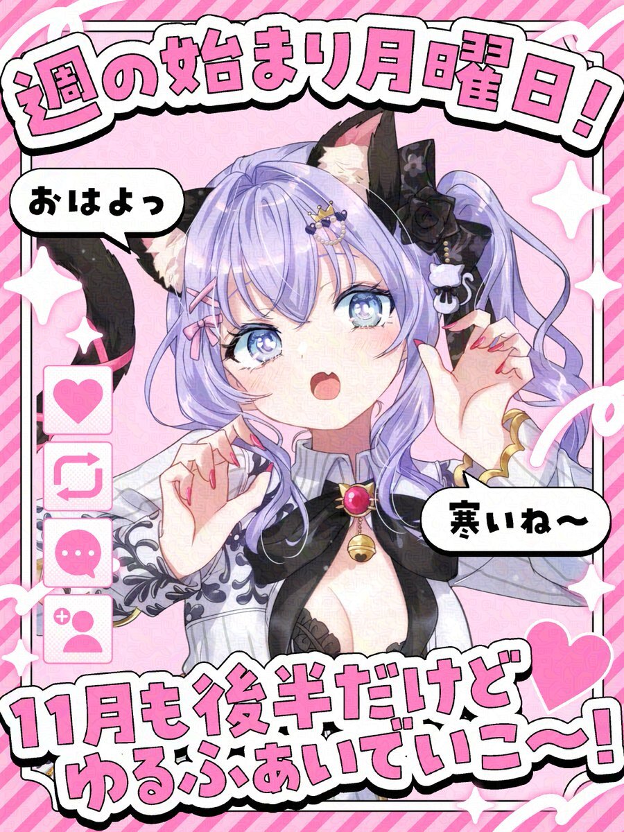 【 #おはようVTuber 】 おはにゃん!✨ 新しい1週間の月曜日です 11月後半もう入った?! 色々パタパタしててもう半月過ごしたか…早いなー でも今月後半もやる事あるから、 楽しみしてくださいね!💕 今日も一緒に無理せず頑張ろう🍀 #11月のVTuberフォロー祭り︎ #個人VTuberだって拡散されたい pic.x.com/13KFbV9vco