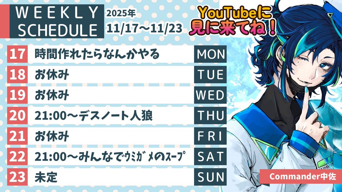 今週のスケジュールです!! まだしばらくはバタバタしてると思いますが、 配信活動頑張ってくぞおおおおお #YouTube #ゲーム実況 #VTuber #Vtuber推し探しにどうぞ #個人VTuberだって拡散されたい #VTuberを発掘せよ pic.x.com/qybn9KsvK1