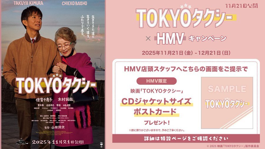 🎬映画『#TOKYOタクシー』𓂃HMVキャンペーン決定🚕³₃𓂃 📅11/21~12/21 店舗にてHMV公式X/Instagramの「キャンペーン画面」をスタッフにご提示頂いた方にポストカードプレゼント❤️ ※無くなり次第終了 x.gd/MlJlH #山田洋次 #倍賞千恵子 #木村拓哉 pic.x.com/lWLHuDkg0J