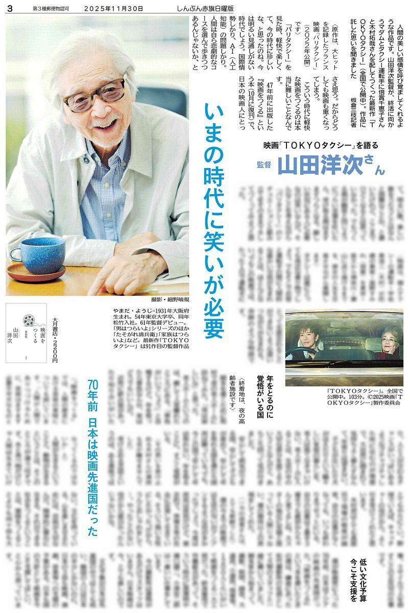 #赤旗日曜版 #11月30日号 映画「#TOKYOタクシー」を語る 監督 #山田洋次 さん いまの時代に笑いが必要 人間の美しい感情を呼び覚ましてくれるような作品です。山田洋次監督が、終活に向かうマダムとタクシー運転手に #倍賞千恵子 さんと #木村拓哉 pic.x.com/U8skQ04ons