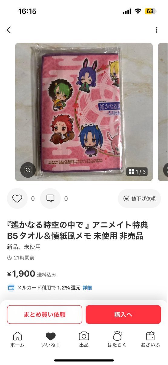 相場がわからなかったのでとりあえずこの値段で出品しています [メルカリ] 『遙かなる時空の中で 』アニメイト特典 B5タオル&懐紙風メモ 未使用 非売品 ¥2,000 招待コード【CTJNZB】でアプリから新規会員登録すると500円分お得に購入できます。 jp.mercari.com/item/m30772620… #遙か #遥か #値段交渉可