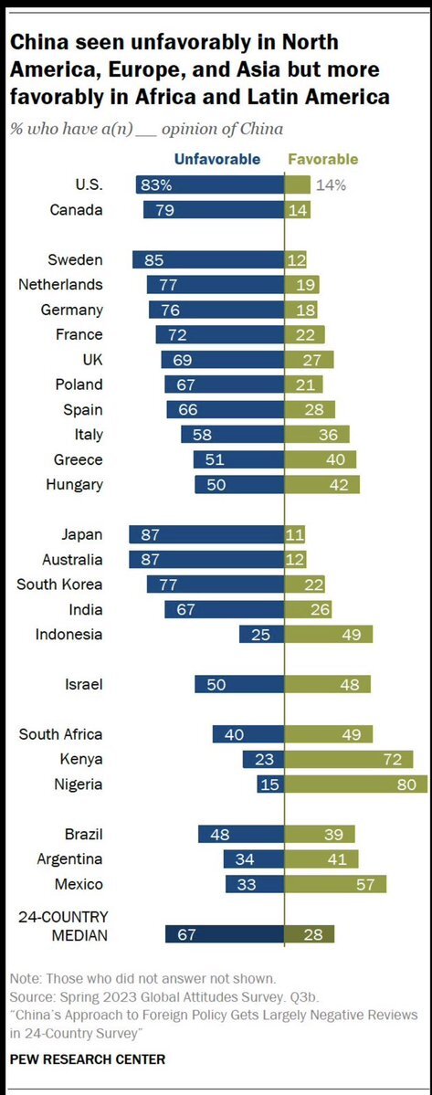 “中国を嫌ってるのは日本だけ” なんて大嘘で、 実際は先進国ほど中国に反感を持っている。 このグラフはその「世界の本音」を数字で見せてる。 👇青は反感、緑は好意的 高く好意的なのは ナイジェリアやケニア ケニアとナイジェリアの好感度が高い理由は、 ①中国の融資とインフラ投資 x.com/losgenedoctor/…