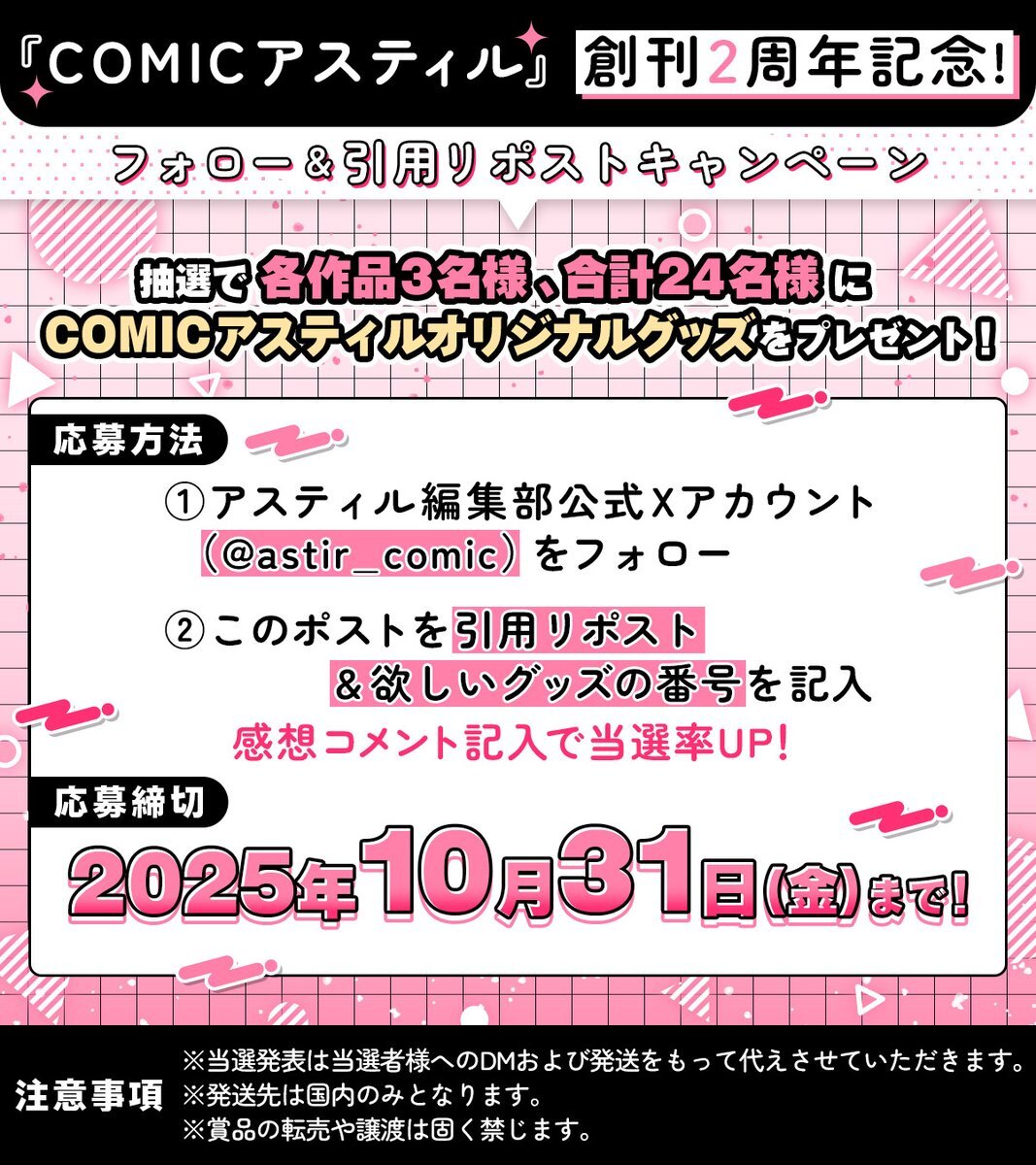 ₊˚✧💜創刊𝟚周年記念💜✧˚₊ フォロー&引用リポストキャンペーン .ᐟ.ᐟ 抽選で各作品𝟑名様、〖合計𝟐𝟒名様〗 に ✧COMICアスティル✧オリジナルグッズをプレゼント🎁 📝応募方法 ①アスティル編集部公式Xアカウント (@astir_comic)をフォロー ②この投稿を引用リポスト