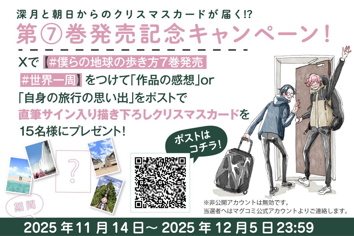 / 「僕らの地球の歩き方」 第7巻発売記念キャンペーン✈️💍 \ 毎回恒例の感想ポストキャンペーン! 今回はクリスマスカード仕様です🎄🌟 (絶対可愛い) ぜひ下記ハッシュタグで 作品の感想や思い出をポストしてください! 皆様のご応募お待ちしております🥰 #僕らの地球の歩き方7巻発売 #世界一周 pic.x.com/FJLkq9W1Bf