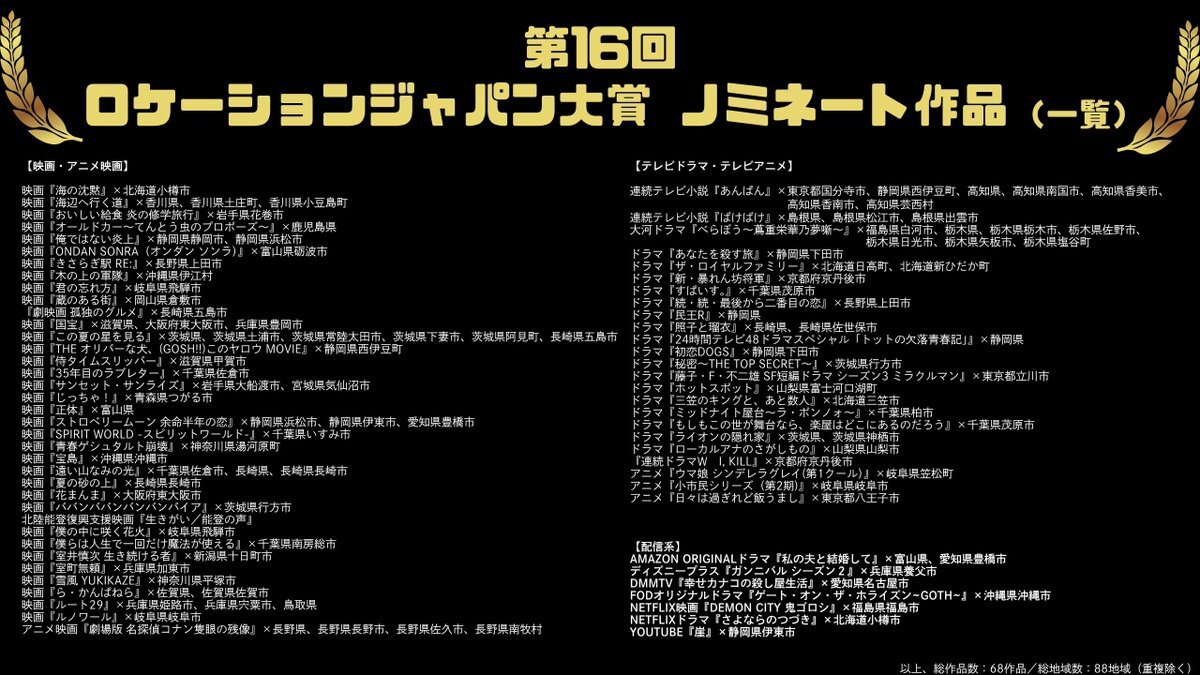 【🎊ノミネート解禁🎊】 第16回ロケーションジャパン大賞のノミネート作品が発表されました! みなさんのお好きな作品はありますか?🧐 ただいま、一般投票のアンケートを受付中です☑ 投票はこちらからお願いいたします🌟↓ forms.gle/dVJC9uEifvAj8J…