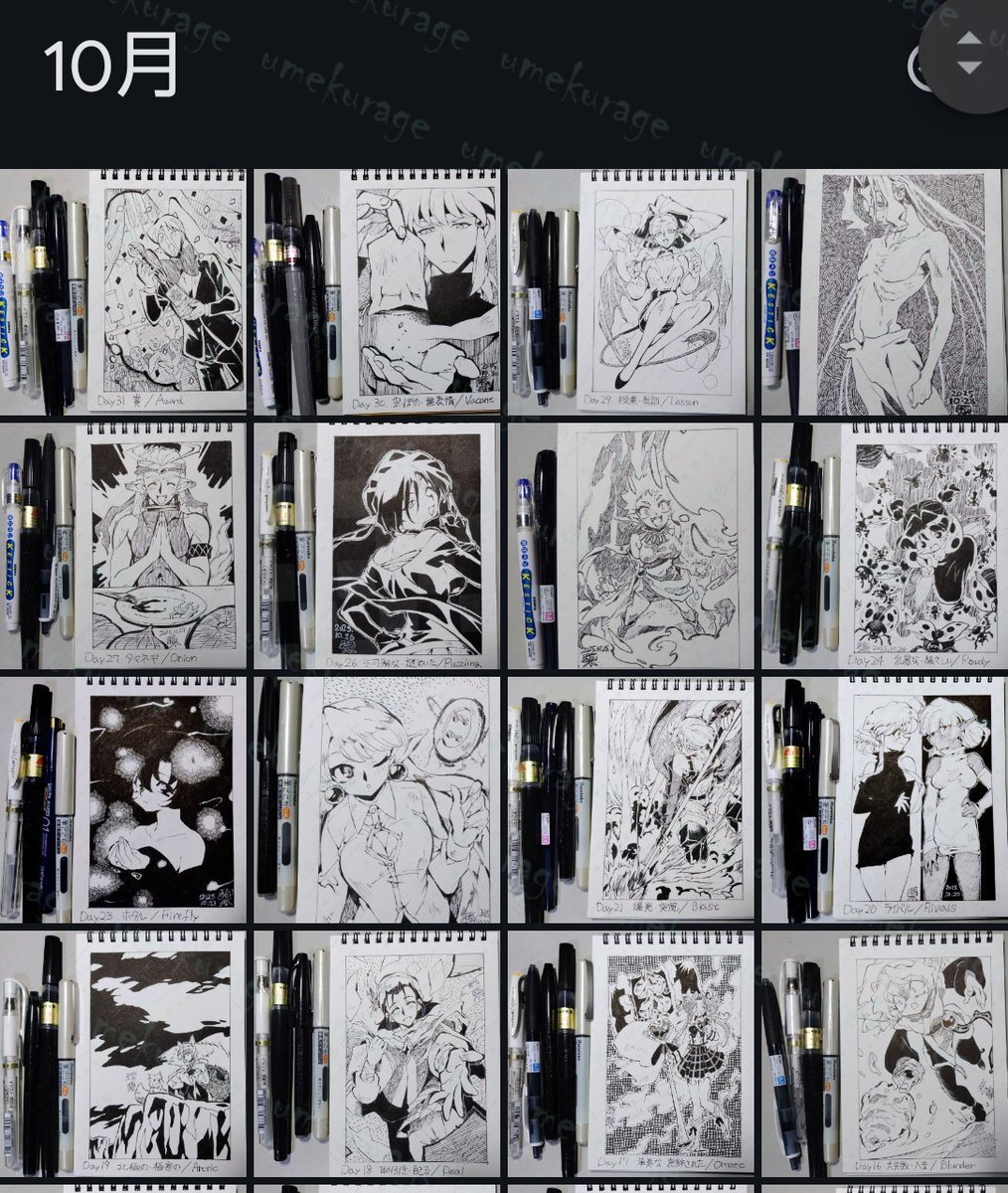 #先月描いた絵を晒そう 10月分。オリキャラ縛りでインクトーバーに挑戦してました。前日夜にペン入れ撮影していたのでDay1だけ9月枠。ラフ案と下描きの半分を先月から仕込んでました pic.x.com/EY55NLaANQ x.com/umekurage6/sta…