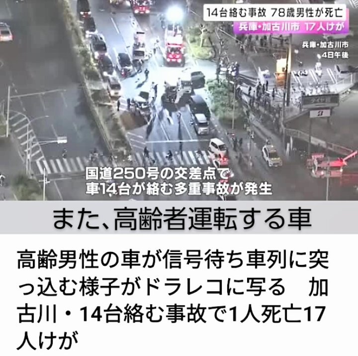 #何の脈絡もない画像を貼ってお昼 また、毎日の よぅに 高齢者運転する車で死亡事故 兵庫県 加古川市で 14台絡む、多重事故。 運転の78歳男は、ぶつかる 直前に 意識を失っていた 可能性も。18人死傷 😱 65歳以上は、#免許返納 を! pic.x.com/fPO2y6wL2F
