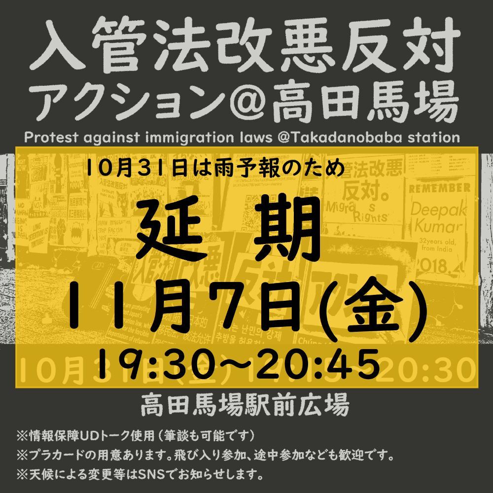 (Blueskyより転記) bsky.app/profile/hodges… 【延期です!】 明日の予報は何度見ても雨なので延期にします。 #入管法改悪反対アクション @高田馬場(駅前広場) 11月7日(金) 19:30~20:45 x.com/390quesorpresa…