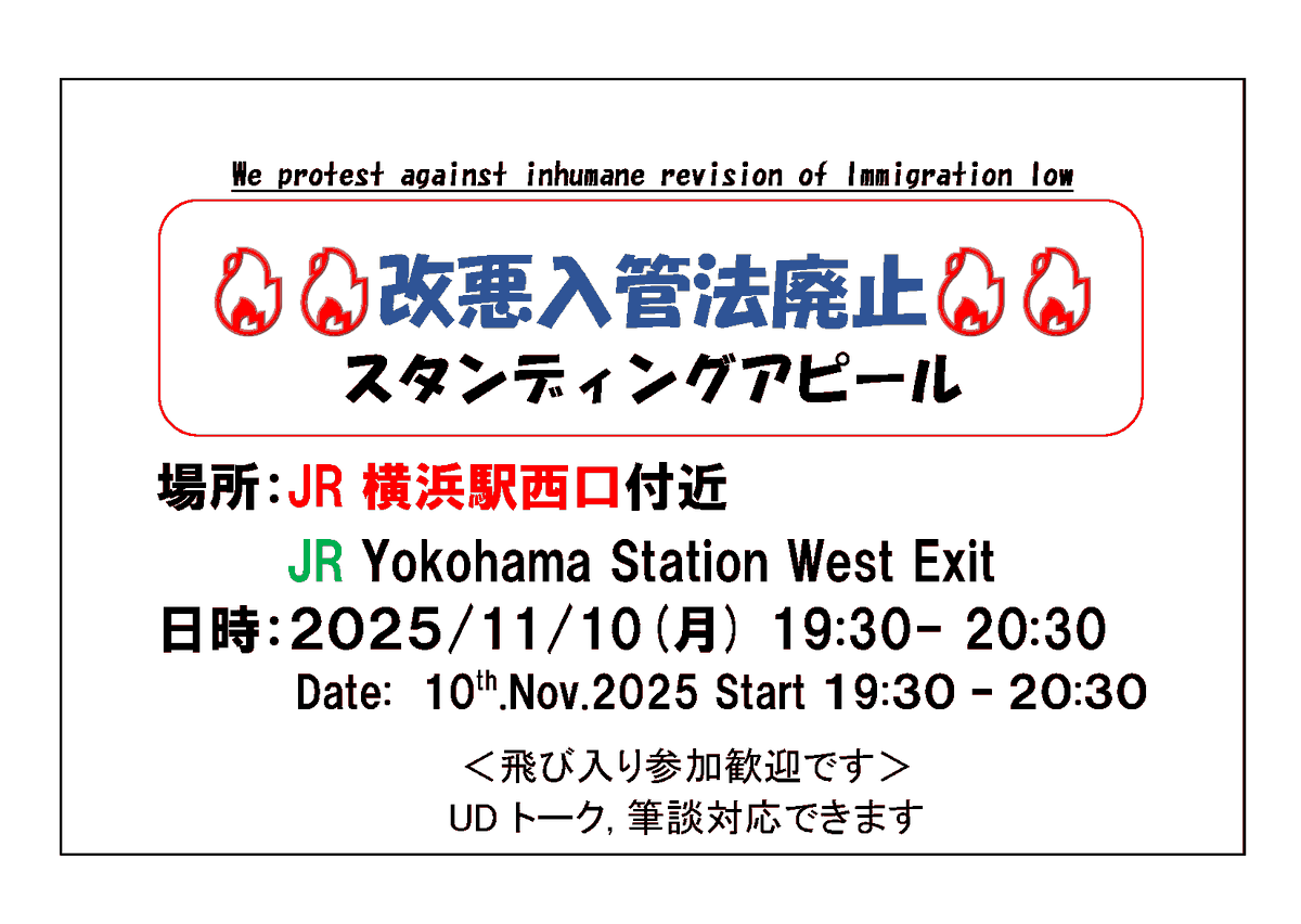 【拡散希望】 11月10(月) JR横浜駅西口 19時30~20時30分 #改悪入管法の施行に反対 #永住許可の取消しに反対 するスタンディング プラカードを掲げ チラシをお配りします。 どうぞ ご無理の無い範囲で! #ゼロプラン反対 #入管法改悪反対アクション