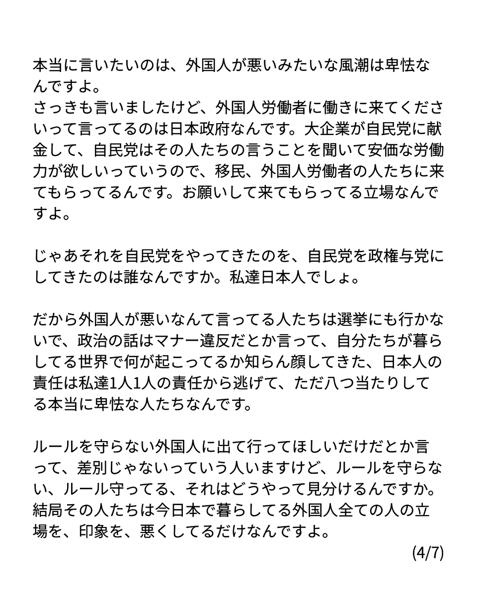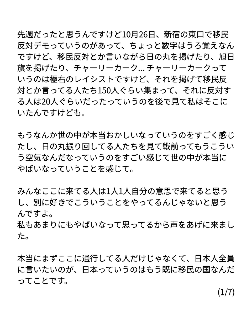 毎度のことですが #入管法改悪反対アクション のスピーチは凄いです。昨日もそうでした。すべてのスピーチが素晴らしく本当は全部ご紹介したいのですが、今回は2つだけ文字起こしします。ひとつは長くて、もうひとつは短いです。 まずは長いほうを。前半です。 pic.x.com/dc3nHchtRS