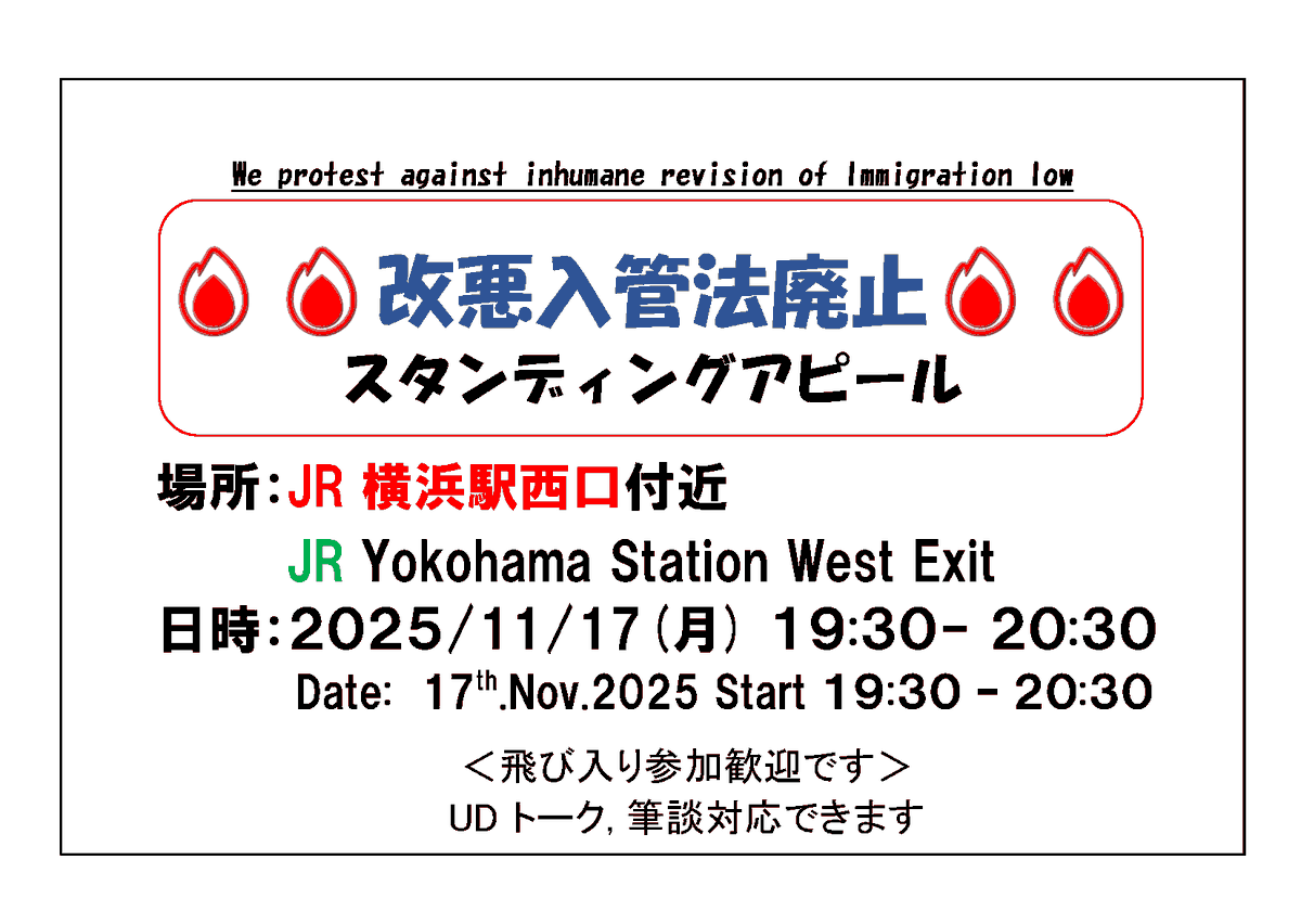 【拡散希望】 11月17(月) JR横浜駅西口 19時30~20時30分 #改悪入管法の施行に反対 #永住許可の取消しに反対 するスタンディング プラカードを掲げ チラシをお配りします。 どうぞ ご無理の無い範囲で! #STOPゼロプラン #入管法改悪反対アクション pic.x.com/g7lw41SDQ9