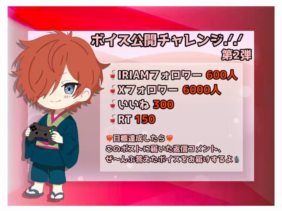 🎙️#ボイス公開チャレンジ 第2弾🎙️ ❤️‍🔥目標達成したら❤️‍🔥 このポストに届いた返信コメント、 ぜ〜んぶに答えたボイスを届ける‼️ たとえば… 「好きな食べ物なに❓」 「最近ハマってることは❓」とかね🫶 #おはようVライバー #IRIAMライバーさんと繋がりたい IRIAM↓ web.iriam.app/s/user/lykXA0j…