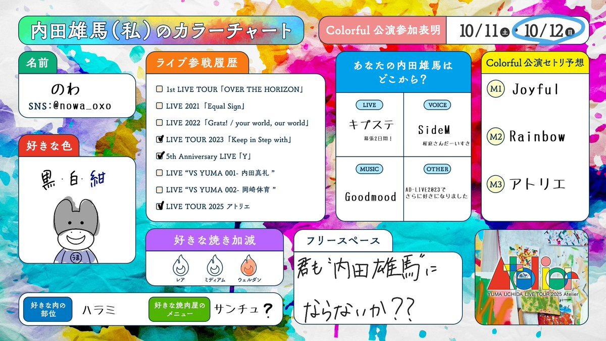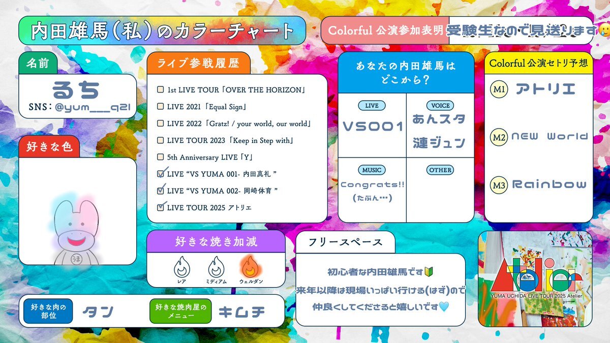カラーチャート完成✨ 追加公演、皆様の感想お待ちしてます☺️ 焼肉屋にはほとんど行きません笑 お肉食べるときはお米が欲しいタイプです #内田雄馬ツアー2025 #全国の内田雄馬と繋がりたい pic.x.com/kpqOqs6ZlL