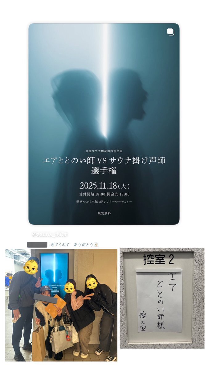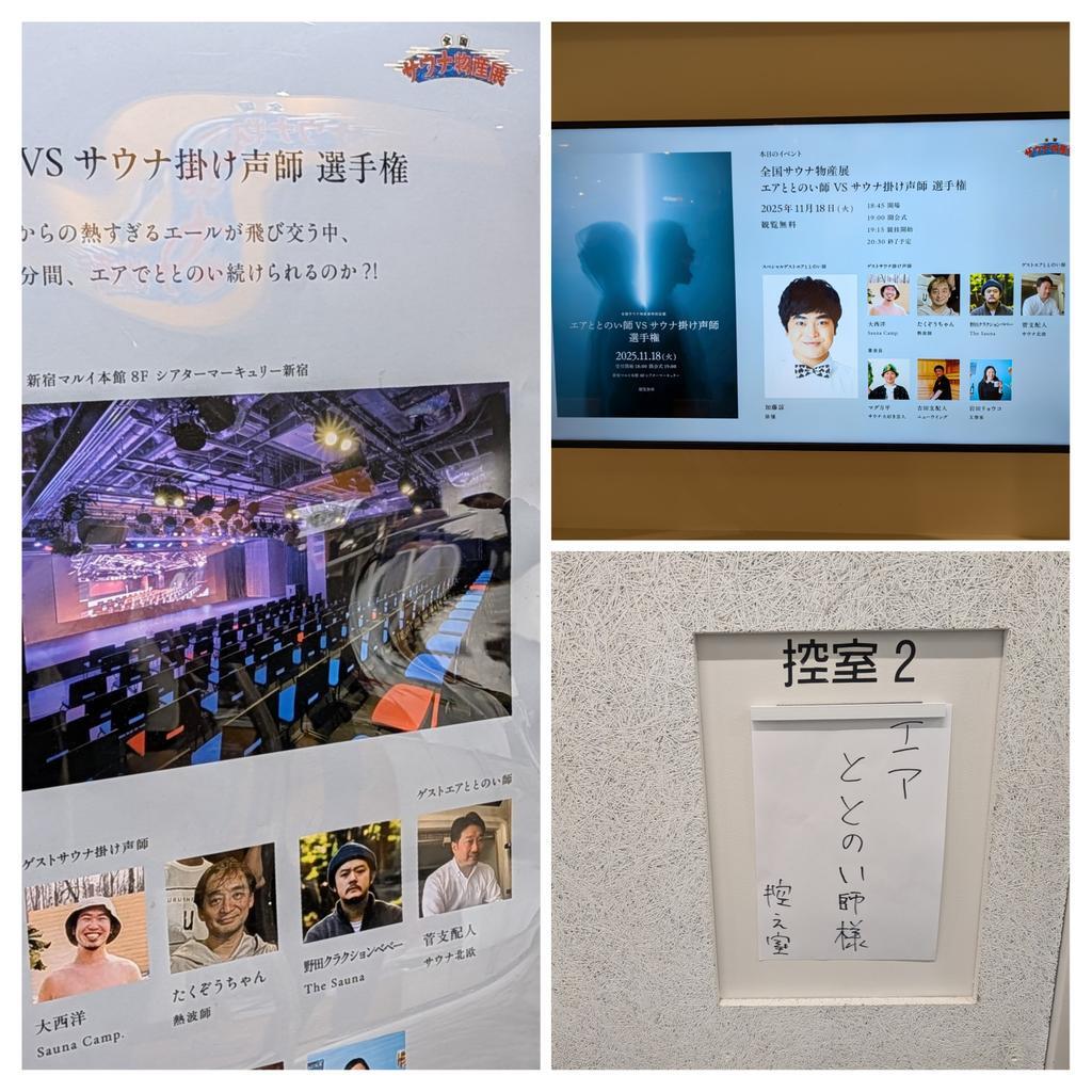 2025 11/18(火) エアととのい師VSサウナ声掛け師選手権 今回もメガネずらして、エアととのい師として参戦 声掛けが面白過ぎて、心が乱れる。涙を流すほど笑ってしまい、無念にも敗退(笑) でも、声掛けには、サウナに対する愛を感じました。ありがとう!また次回も出たいな。 #全国サウナ物産展 pic.x.com/UHurSSjt3u
