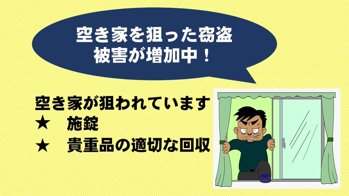 #全国地域安全運動 実施中! 10/11-10/20 \ 倒壊家屋に対する窃盗被害に注意しましょう! 長期間不在となっている #空き家 への窃盗犯罪が増加傾向にあります 被害に遭わないために、今一度   施錠・貴重品の適切な回収 をよろしくお願いします pic.x.com/03x8nO8WrV