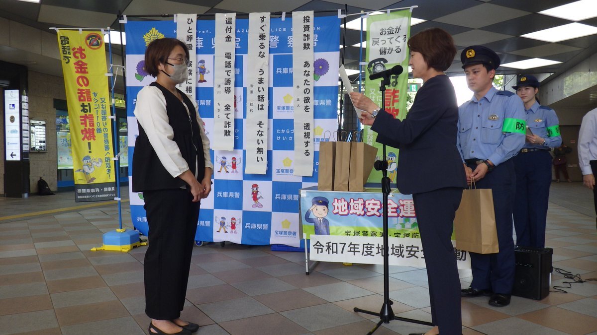 【特殊詐欺被害防止啓発活動 #宝塚署#全国地域安全運動 に伴い、宝塚市内の郵便局や学生防犯ボランティア、小・中学生のバトン隊の皆さまと連携した特殊詐欺被害防止啓発キャンペーンを行いました。当日は、郵便局員の方々が考えた特殊詐欺被害防止警察標語の優秀作品表彰式も行いました。 pic.x.com/tpCtsE6PJF