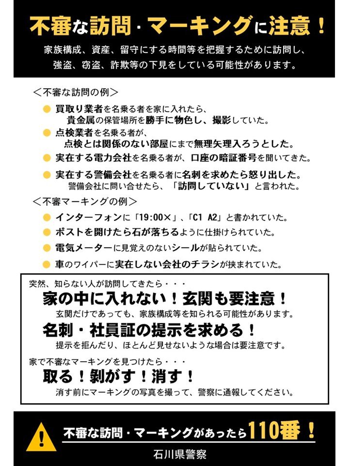 / 不審な訪問・マーキングに注意! \ 🚨依頼していないのに #買取り業者#点検業者 が訪問して来る 🚨インターホンに「19:00×」「C1、A2」等と書かれている 🚨電気メーターに見覚えのないシールが貼られている このような不審なことがあれば110番してください! #全国地域安全運動 10/11-10/20 pic.x.com/9404PhLEdt