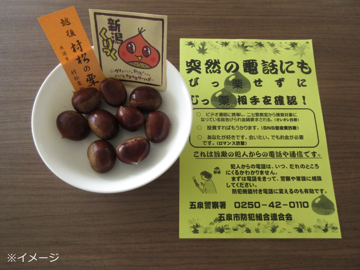#五泉警察署 は、#ラポルテ五泉 で特殊詐欺被害防止広報を実施しました。 特殊詐欺被害防止のチラシとともに、五泉市村松の名産品である栗を配布し、特殊詐欺被害防止を呼びかけました🌰 パトカーの展示も実施し、小さなお子さま達にも大盛況でした!🚓💨 #国際電話利用休止 #全国地域安全運動 pic.x.com/qVpx8hRJpi