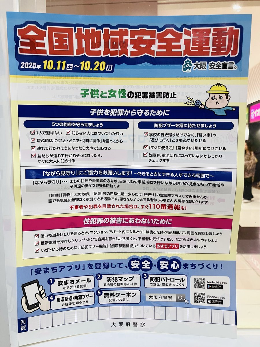 現在、全国地域安全運動が実施中です!イオンモール四條畷でもイベントが開かれました。みなさん気をつけましょう! 安まちアプリを入れるとお得なクーポンもあるらしいです(*^^*) やり方が分からない方は教室へお越しくださいね。 #全国地域安全運動 #大阪府警察 #イオンモール四條畷 pic.x.com/kBre4482gW x.com/opp_seian/stat…