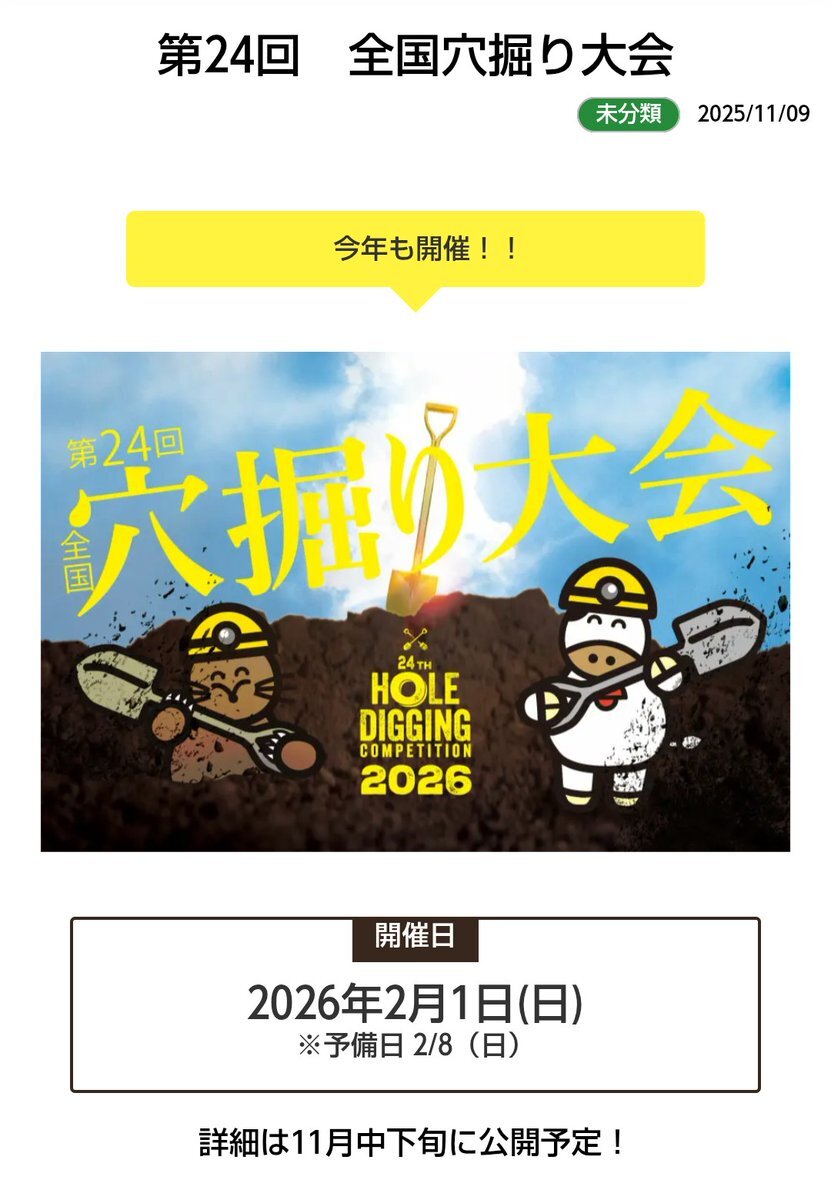 成田ゆめ牧場公式サイトでこっそりと第24回全国穴掘り大会の日程が出てたぞ! 2026年2月1日(日)だぞ! 詳細はもうすぐ発表になるみたい コラボがあるのかどうか、無くても出るけど楽しみ(*´ω`*) yumebokujo.com #成田ゆめ牧場 #全国穴掘り大会 pic.x.com/2UqPmJoraX