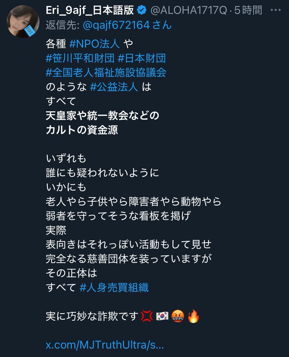各種 #NPO法人#笹川平和財団 #日本財団 #全国老人福祉施設協議会  のような #公益法人 は すべて 天皇家や統一教会などの カルトの資金源 疑われないように 表向きはそれっぽい活動もして見せ 完全なる慈善団体を装っていますが その正体は すべて #人身売買組織 実に巧妙な詐欺です💢🇰🇷🤬🔥 x.com/ALOHA1717Q/sta…