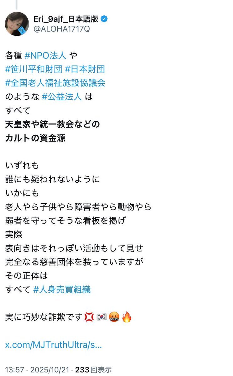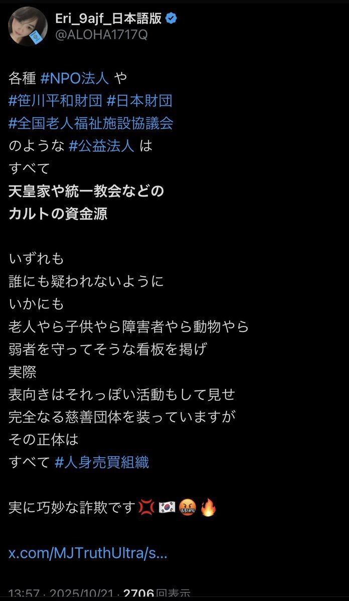 各種 #NPO法人#笹川平和財団 #日本財団 #全国老人福祉施設協議会  のような #公益法人 は すべて 天皇家や統一教会などの カルトの資金源 #人身売買の隠れ蓑 x.com/ALOHA1717Q/sta…