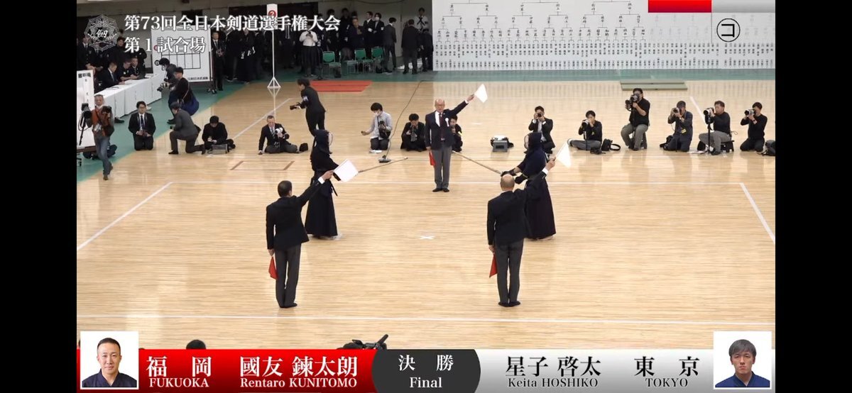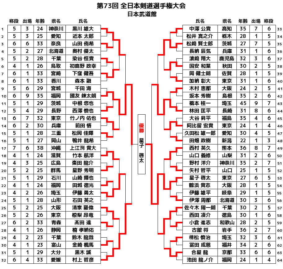 [ 第73回 全日本剣道選手権大会 ] 優勝 星子 啓太(東京) ※4年ぶり2度目 2位 國友 錬太朗(福岡) 3位 林田 匡平(長崎) 3位 村上 哲彦(愛媛) [ 第64回 全日本女子剣道選手権大会 ] 優勝 高橋 萌子(神奈川)※7年ぶり3度目 2位 大嶋 友莉亜(大阪) 3位 柿元 冴月(福岡) 3位 妹尾