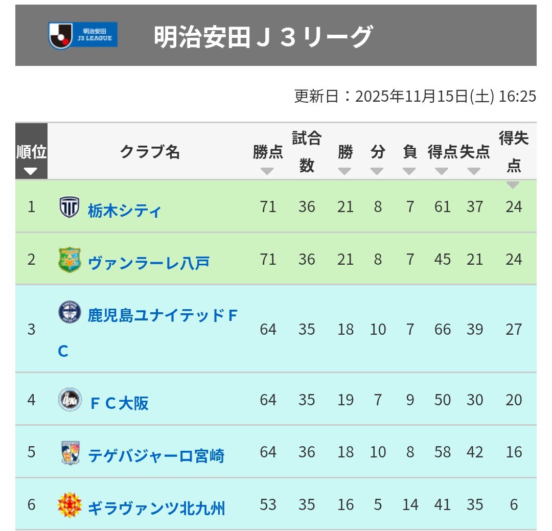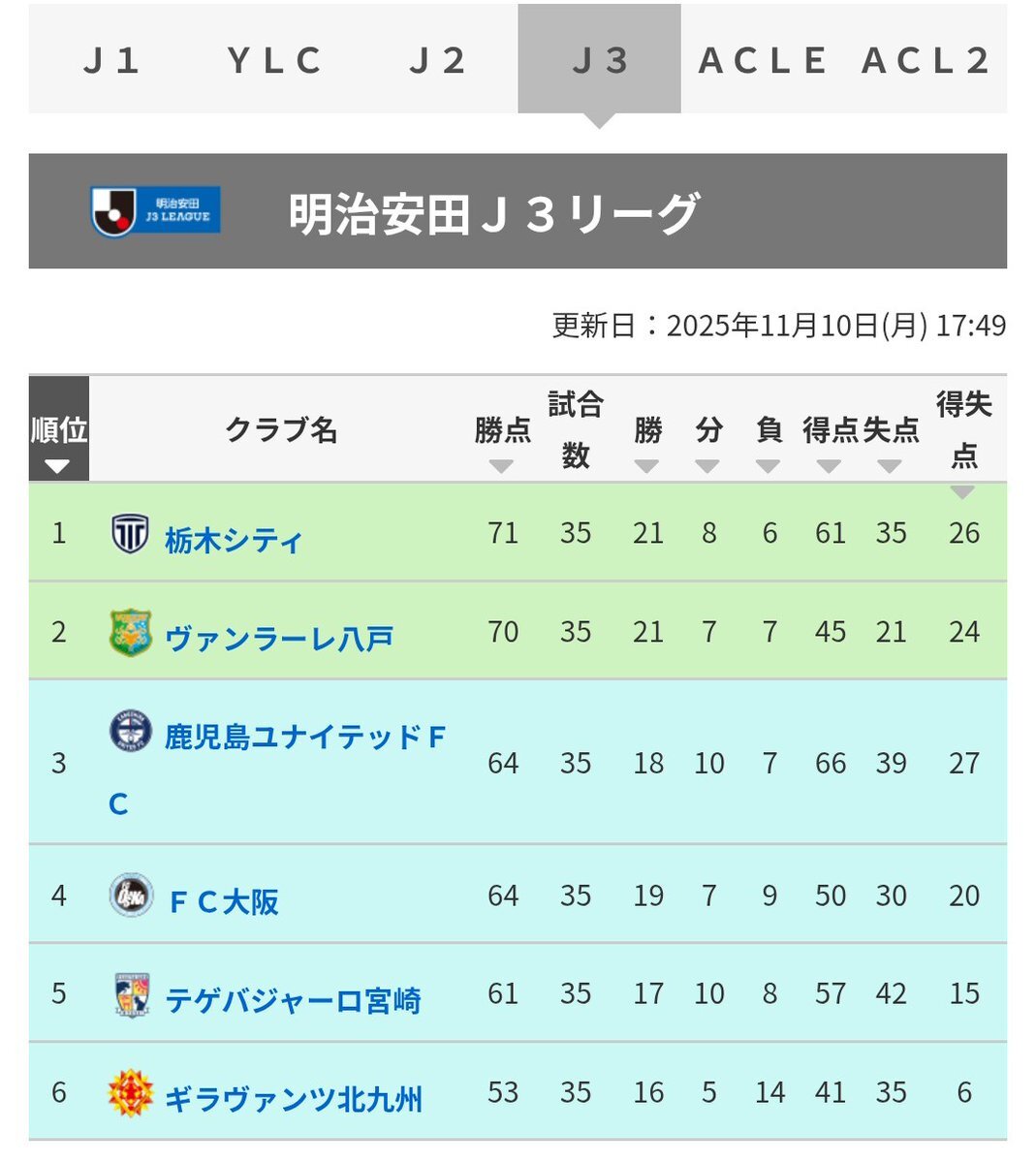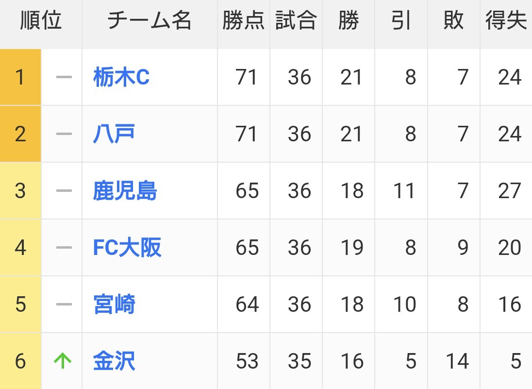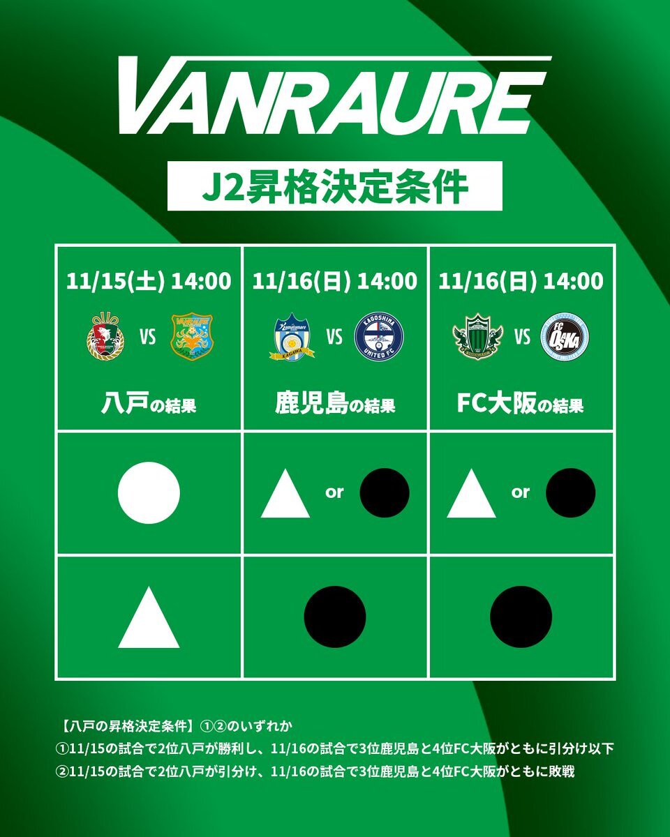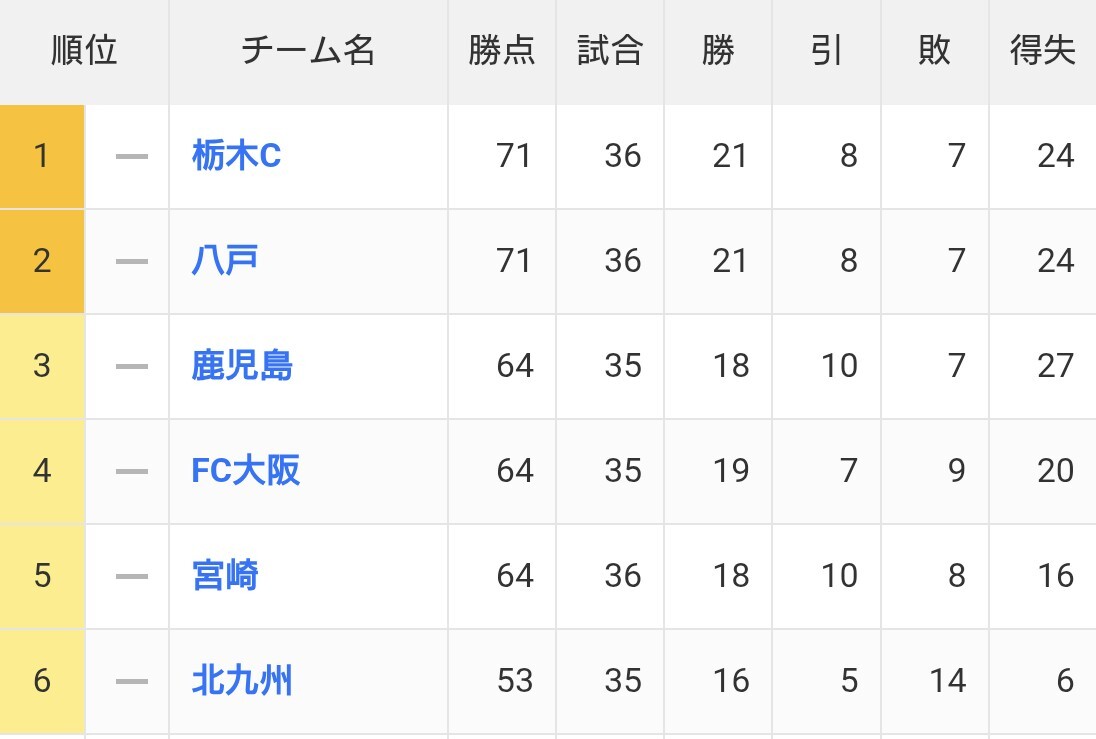試合終了 0-0で引き分けるも栃木Cが敗れた事で勝ち点と得失点が並ぶ事態に!明日鹿児島と大阪が引き分け以下なら2位以内が確定するが優勝の行方は全くわからなくなった!次節ホーム最終戦で決めたい所だ。現地組の皆さん応援お疲れ様でした😊 #ヴァンラーレ八戸 #全緑 #総緑戦 pic.x.com/R0NzWpRoH3