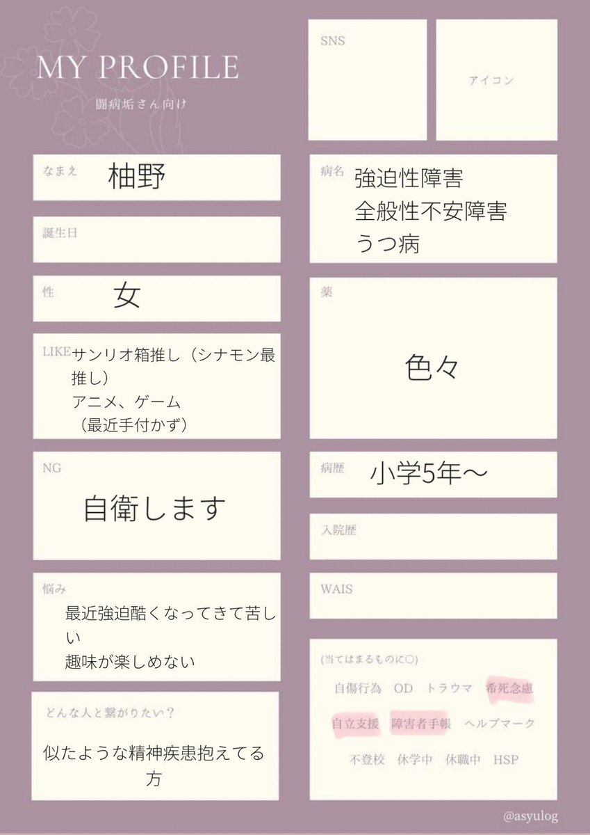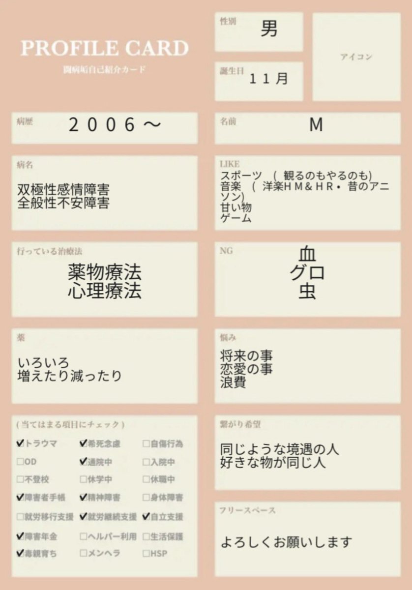 ♀/ XNFP-T / 元看護師 #全般性不安障害 #うつ病 2025.1発症 内服調整中 (メイラックス、レクサプロ、ワイパックス) 無職 引きこもり セルフネグレクト 同じ境遇の方と知識や福祉などの情報交換ができたら嬉しいです 画像原本を探すのが億劫で文面で失礼します #闘病垢 #闘病垢自己紹介カード