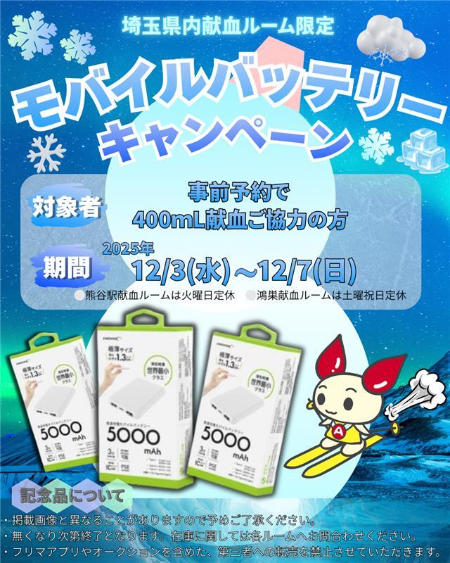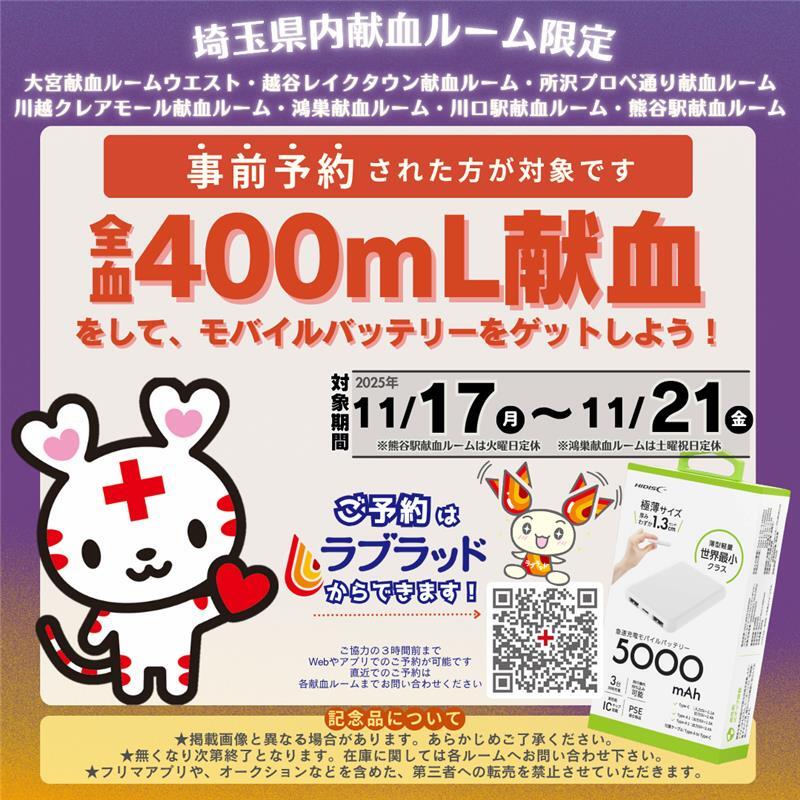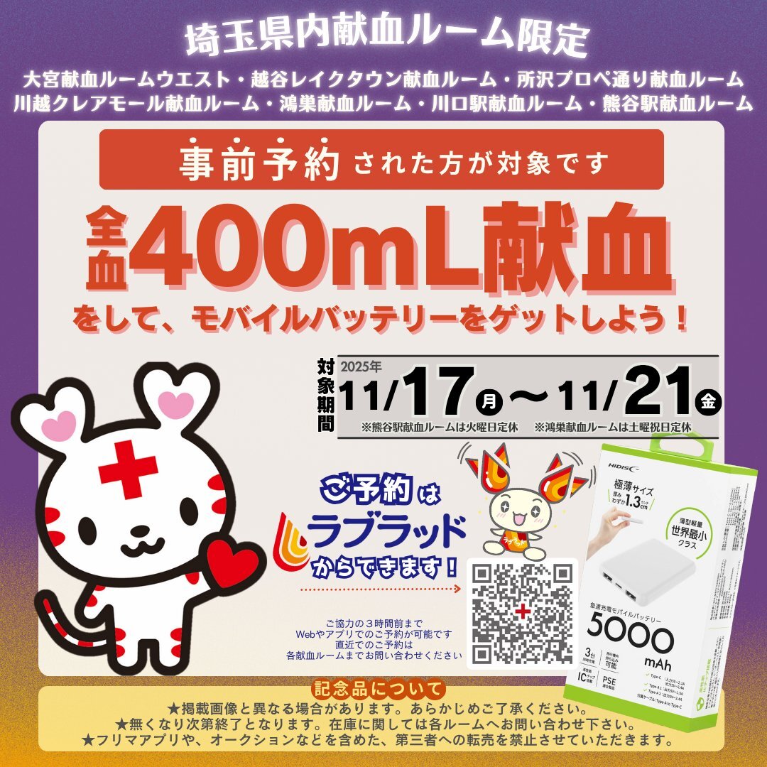 📣明日から始まる!! \ 埼玉県内 #献血ルーム 限定 / #全血400mL献血 予約キャンペーン💜 対象期間中にご予約のうえ、400mL献血にご協力いただいた方へ #モバイルバッテリー をプレゼント⚡ 皆様のお越しを心よりお待ちしております🩸 #献血 #大宮 #大宮献血ルームウエスト #拡散希望 pic.x.com/k77Kz2V6yv