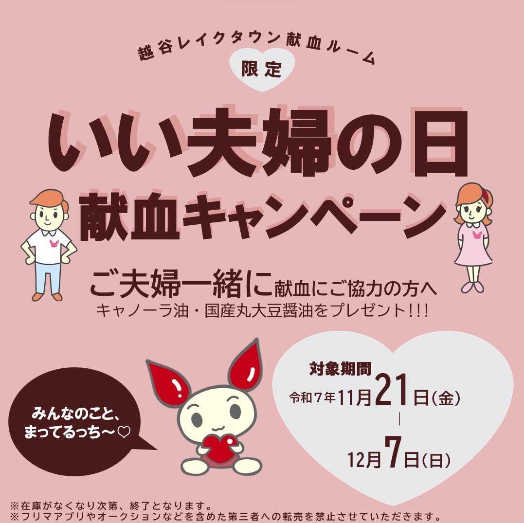 #越谷レイクタウン献血ルーム よりお知らせ 本日で2つのキャンペーンが終了 #全血400mL献血 予約キャンペーン #いい夫婦の日 ❤キャンペーン 本日 #全血献血 は14:15以降空き◎ 当日予約もお気軽にお問い合わせ下さい📞 #レイクタウン へお買い物でお越しの際など #献血 にご協力をお願いいたします pic.x.com/3IkJD0VjJV