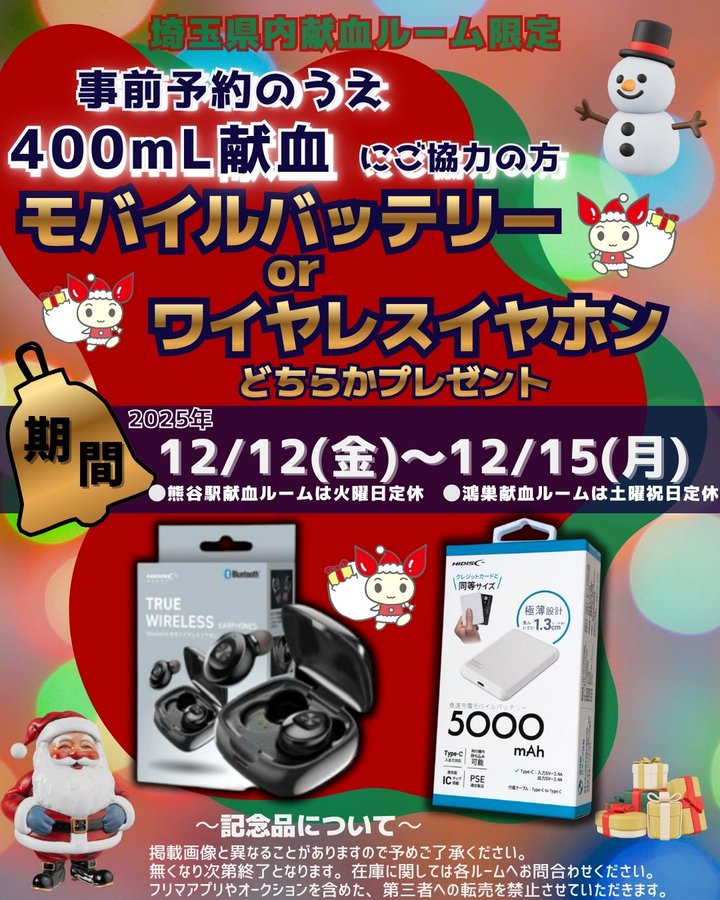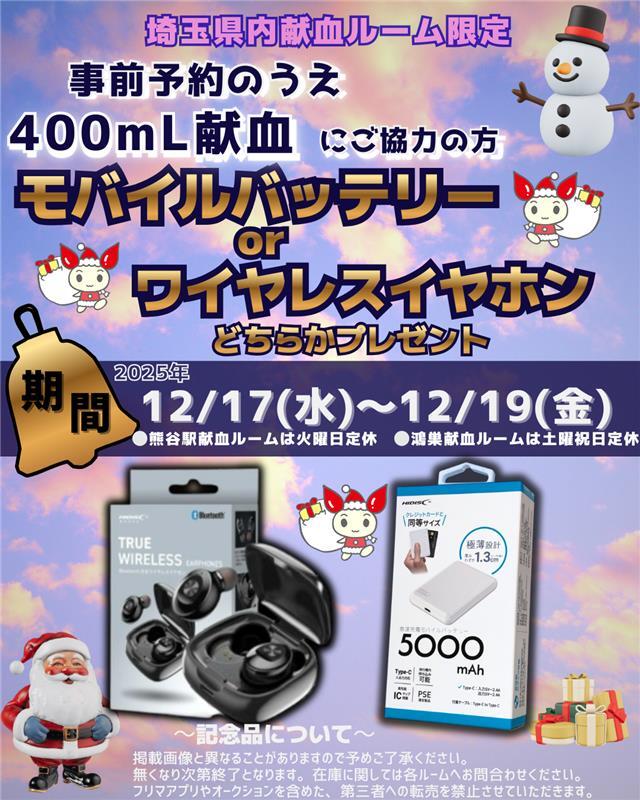 🎊選べる大好評キャンペーン🎊 いよいよ明日15日が最終日! ご予約いただき #全血400mL献血 にご協力いただいた方に #モバイルバッテリー🔋または #ワイヤレスイヤホン 🎶をプレゼント🎁 勿論、当日のご予約でもOK🙆【終日空きあり】 #ラブラット📱やお電話☎️(048-987-3737)でお待ちしております🙇 pic.x.com/NFa7xBR5je