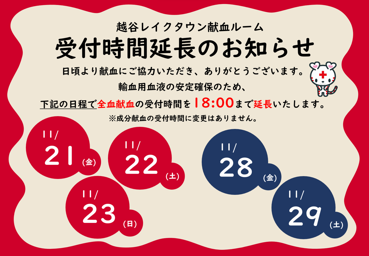 明日も輸血用血液の安定確保のため、#全血献血 の受付時間を18時🕕まで延長いたします❗️ #全血400mL献血 は予約枠にまだ空きがあります 様々なキャンペーンも開催中❤️ 詳細は⇩画像をご確認ください 🌳#レイクタウン🐥 に #ブラックフライデー🐼 でお買い物の際、ご協力をお願いいたします pic.x.com/EVMpoyHA1q