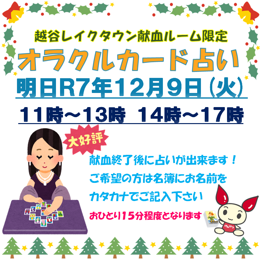 本日 #オラクルカード占い 実施します🔮 献血終了後に占いができますのでご希望の方は受付にてお申し付けください🙇♂️ #全血献血 は11時45分以降予約枠に空きがあります🌈 ただいますべての血液型の方に #全血400mL献血 のご協力をお願いしております🥲 この機会に #献血 へのご協力もお願いします🎅 pic.x.com/RjqI1r2qus