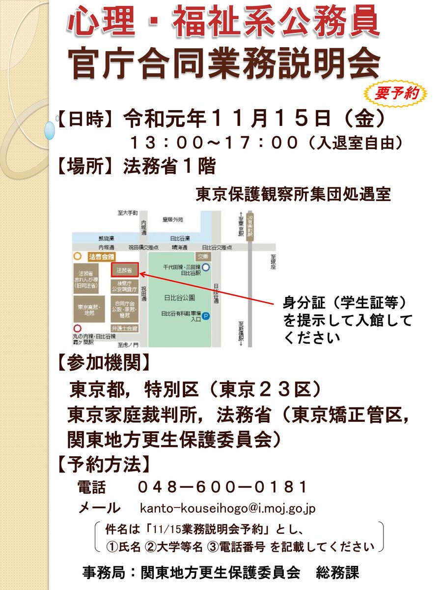 心理系・福祉系で受験を考えている方は、積極的に参加しましょう!! #公務員 #法務省 #東京家庭裁判所 #東京都 #特別区 #23区 #福祉 #心理 #合同業務説明会 #公務員試験研究所 x.com/MOJ_HOGO/statu…