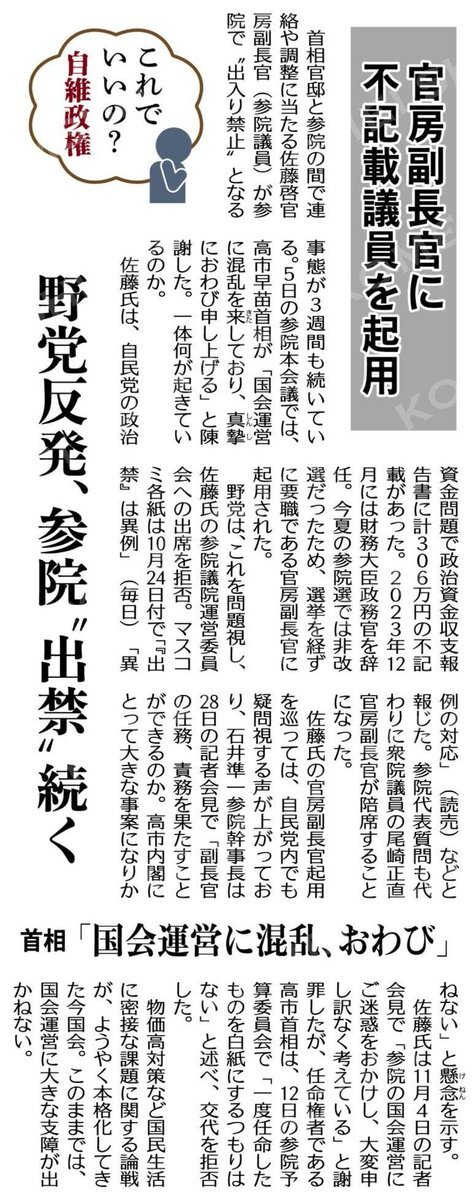 #公明党がいる安心 #RICE #大衆とともに #小さな声を聴く力 (これでいいの?自維政権)官房副長官に不記載議員を起用/野党反発、参院“出禁”続く/首相「国会運営に混乱、おわび」 #公明新聞電子版 2025年11月13日付 komei.or.jp/newspaper-app/ pic.x.com/lOWY2ssuaN