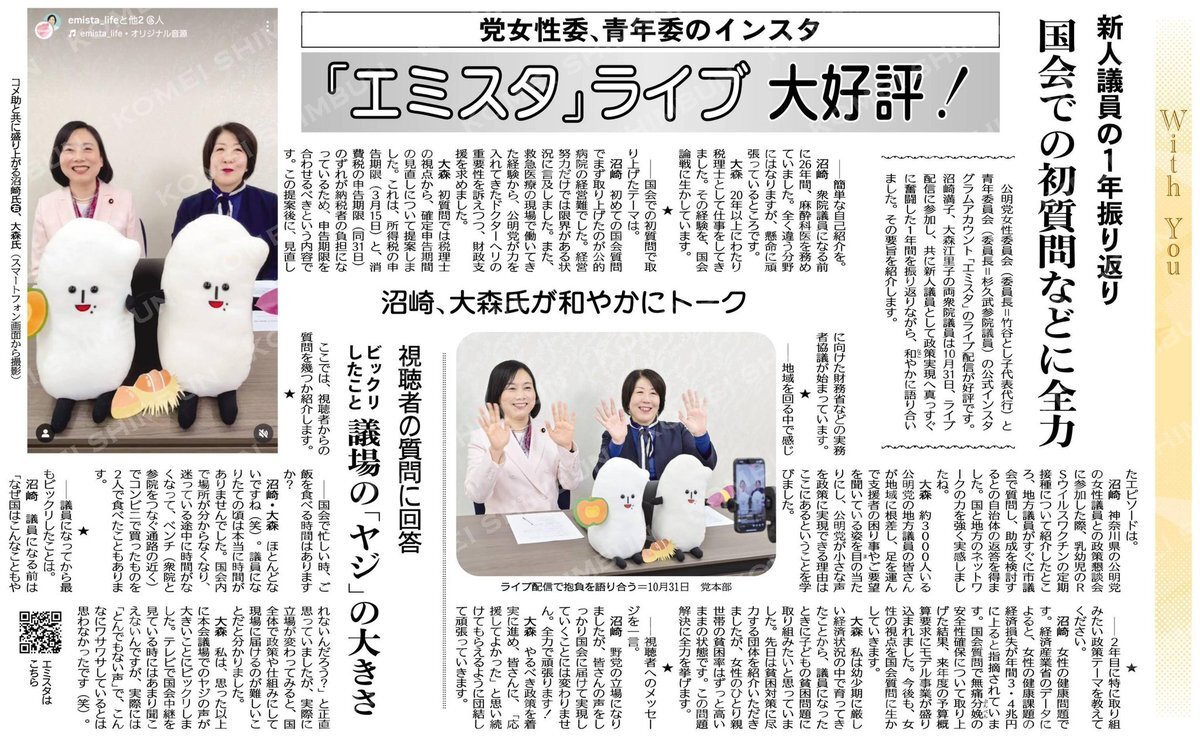 #公明党がいる安心 #RICE #大衆とともに #小さな声を聴く力 (With You)党女性委、青年委のインスタ「エミスタ」ライブ大好評!/沼崎、大森氏が和やかにトーク #公明新聞電子版 2025年11月12日付 komei.or.jp/newspaper-app/ pic.x.com/XlkxTrAuGz