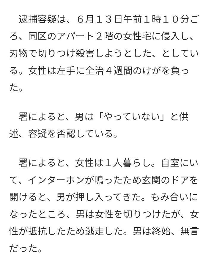 【面識なし】インターホンで玄関を開けた女性が刺される、26歳男を逮捕 横浜 news.livedoor.com/article/detail… 6月13日午前1時10分ごろ女性宅に侵入した疑い。女性は1人暮らしで、インターホンが鳴ったためドアを開けると男が押し入ってきた。男は女性を切りつけたが、女性が抵抗したため逃走した。