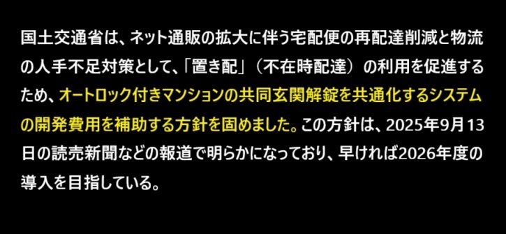 公明党が「置き配」と「オートロック付マンションの共同玄関解錠」を進めている。安全対策も実効性があるとは思えない。運転手がかってに鍵を開けていいのなら合鍵を他人に預けるのと同じだ。それと同時に公明党は外国人ドライバーを増やすことに熱心だ。本当の目的はなんだ?