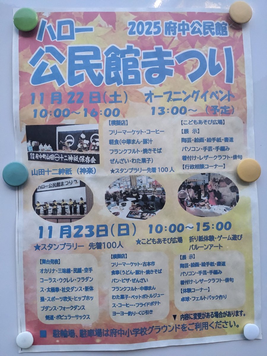 【ハロー公民館まつり2025 開催✨】 ■場所 府中公民館 [ 広島県安芸郡府中町本町2丁目15-1 ] ■日時 11月22日(土) 10:00-16:00 11月23日(日) 10:00-15:00 府中町の神楽『山田十二神祇』などの舞台や、フリーマーケットなどの模擬店など‼️ ぜひお越しください😆 #公民館まつり #府中町 #神楽 pic.x.com/CzkSpIYxTu