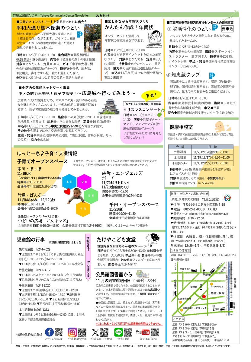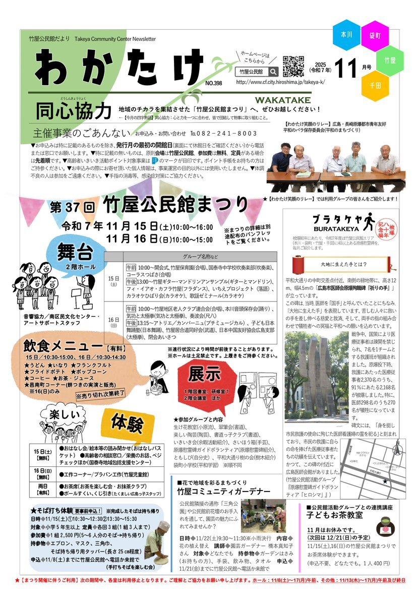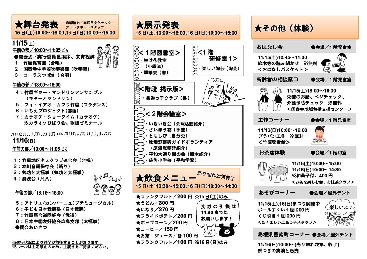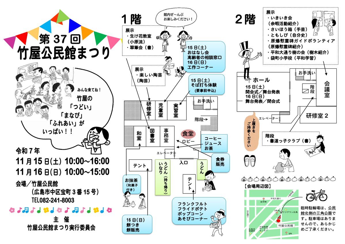 【竹屋公民館まつり】いよいよ明日15日(土)と16日(日)は第37回竹屋公民館まつりです!国泰寺中学校吹奏楽部の演奏や、公民館グループ等による舞台発表や作品展示、飲食バザーや体験コーナーもあります。16日(日)は餅つきの実演と販売もあります。ご来場をお待ちしています。#竹屋公民館 #公民館まつり pic.x.com/Ntez8Vxa2U