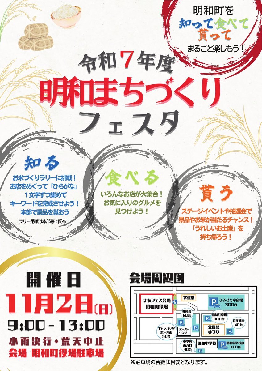 🌾令和7年度 明和まちづくりフェスタ開催🌾 今年のテーマは『お米』🌾 ぜひ、秋のイベント #明和まちづくりフェスタ へお越しください🎶 📅11/2㈰ 9:00~13:00※小雨決行・荒天中止 🏢明和町役場駐車場 【主催:明和まちフェス運営委員会】 詳しくは🔗から town.meiwa.gunma.jp/life/soshiki/s… #群馬県明和町