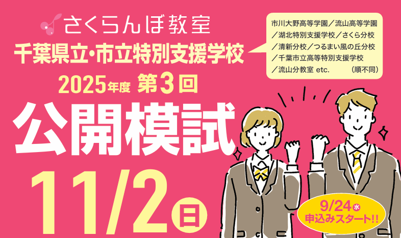 全会場、予定通りに試験を開始しています⏰今年度ラストの公開模試‼️「次」につながる大切な模試です。千葉県の皆さん頑張って!東京は11/5〜出願ですね!(いずみ) #公開模試 #特別支援学校 #さくらんぼ教室 x.com/sakuranbo_clas…