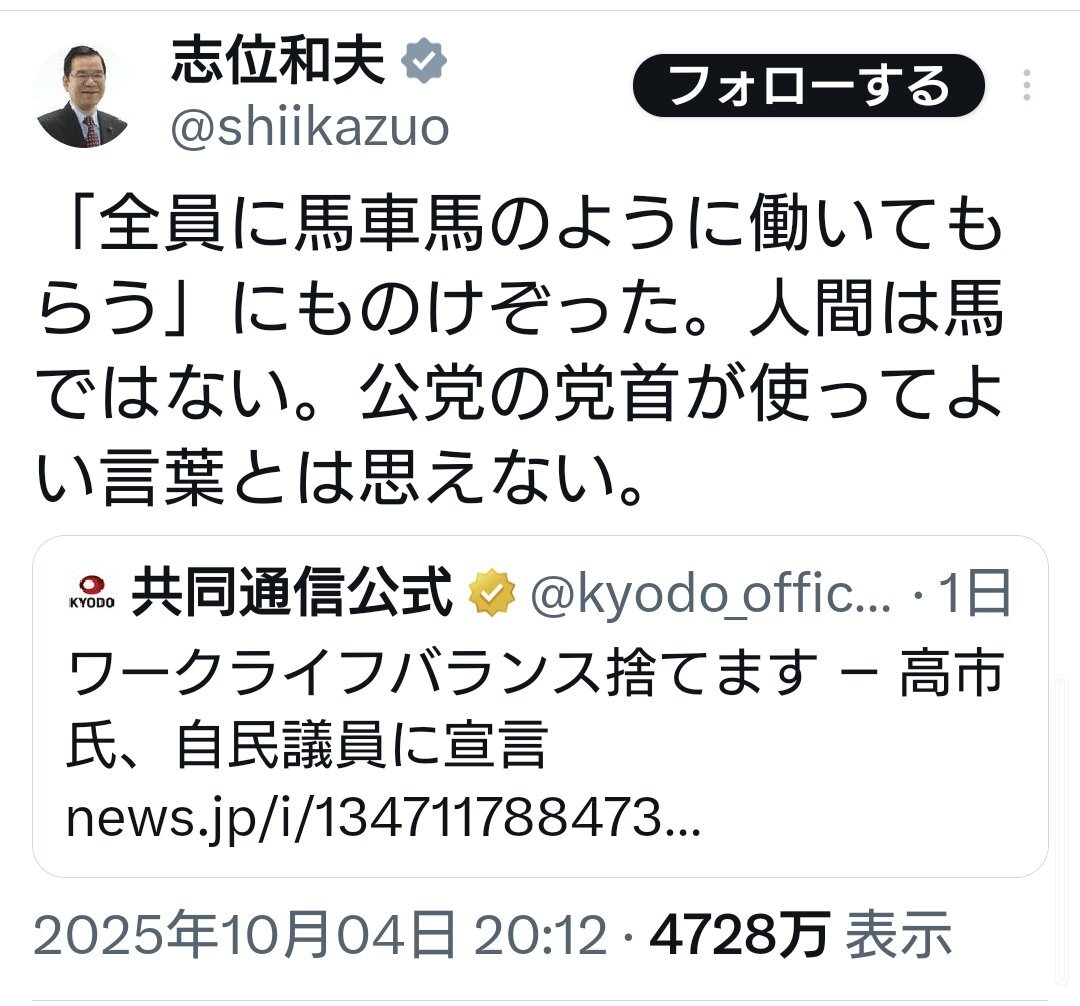 前党首である志位和夫氏は >「全員に馬車馬のように働いてもらう」にものけぞった。人間は馬ではない。 と投稿しました。 x.com/shiikazuo/stat… 政治家による【事実を捻じ曲げた印象操作】は、支持に繋がらないと思います。 #共産党は日本の敵 pic.x.com/rZCivnM2i1 x.com/pioneertaku84/…