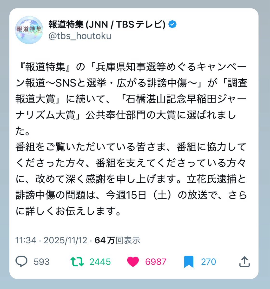 返信先:@motohikosaitoH今週15日(土) は #報道特集 放送! 兵庫県に関連した放送で【調査報道大賞】に続き【石橋湛山記念早稲田ジャーナリズム大賞】公共奉仕部門の大賞受賞🎊 『立花氏逮捕と誹謗中傷の問題』 なぜ #兵庫県は異常っていう状況を超えている のか全国の皆様見て下さい #斎藤元彦は公益通報者保護法違反 pic.x.com/Y48W7fVH6a