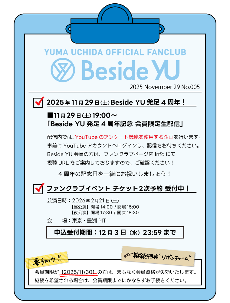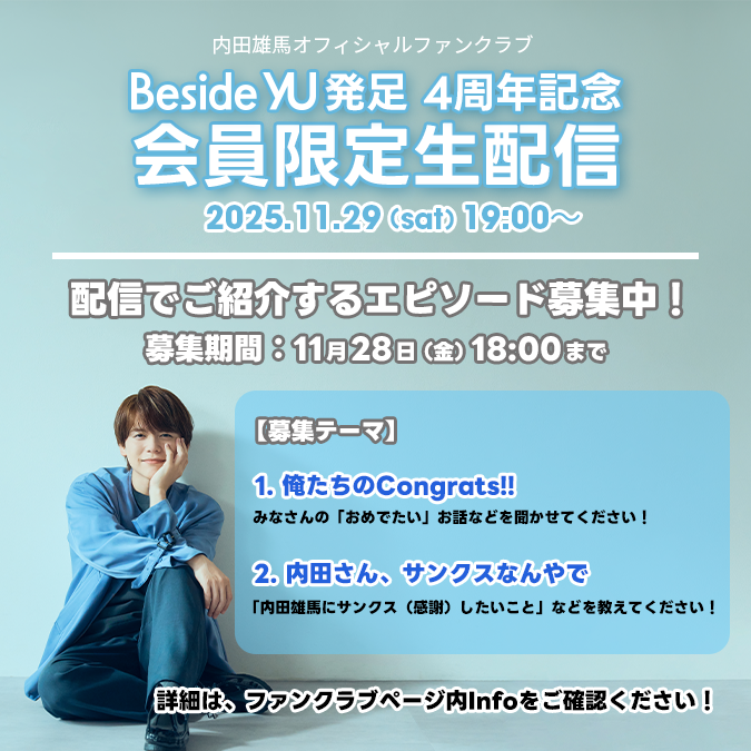 #内田雄馬 OFFICIAL FANCLUB 💎Beside YU Information💎  ̄ ̄ ̄ ̄ ̄ ̄ ̄ ̄ ̄ ̄ ̄ ̄ ̄ ■本日19:00~ Beside YU発足4周年記念 会員限定生配信 🌐uchidayuma.com/information/?i… #内田雄馬29カンパイ 📋最新情報⬇️をチェック‼️ 🌐besideyu.club/fanclubtop/inf… 🍖新規入会はこちらから 🌐besideyu.club/tokuten pic.x.com/KX0eXHybID